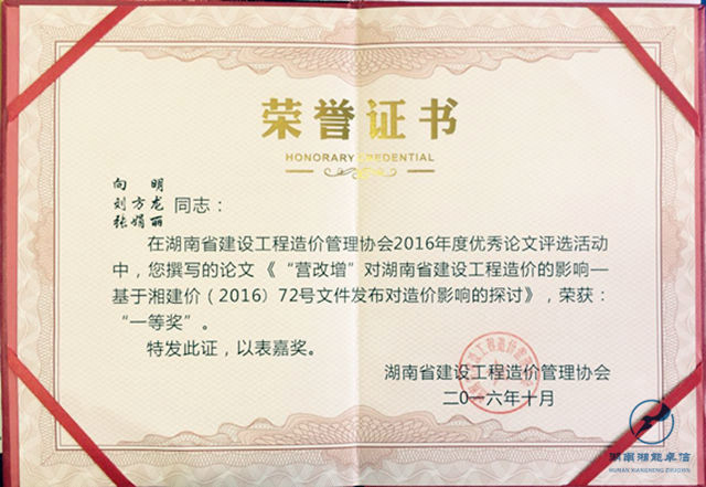2017年2月28日下午,湖南省建设工程造价管理协会在省委招待所举行了2016年工程造价优秀论文交流表彰会,我公司共有11篇论文获奖,其中向明、刘方龙、张娟丽撰写的《浅析“营改增”对湖南省建设工程造价的影响》获得一等奖。