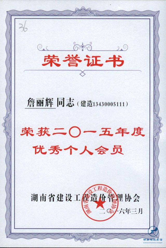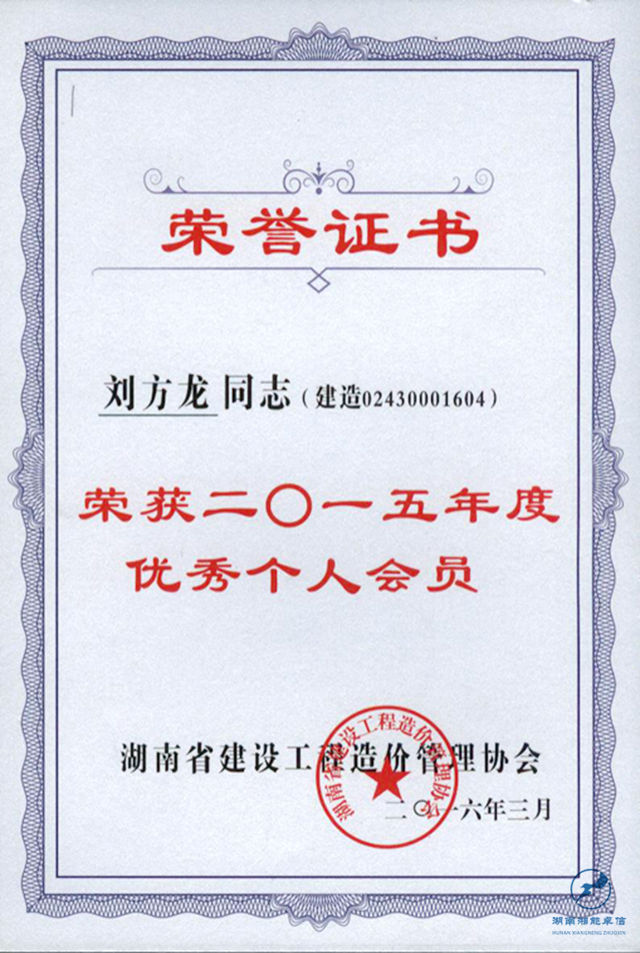 2015年12月湖南省建设工程造价管理协会组织开展了2015年度先进单位会员、先进个人会员、先进单位、协会先进工作者评选活动,我司获得“2015年度先进单位会员”称号,刘方龙、詹丽辉获得“先进个人会员”称号。